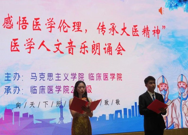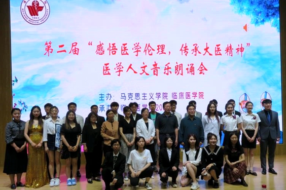 6月4日晚,我校第二届“感悟医学伦理,传承大医精神”医学人文音乐朗诵会在思政课虚拟仿真实践教学中心举行。本次活动由马克思主义学院、临床医学院主办,临床医学院2019级承办。马克思主义学院党总支书记程乐森、药学院正处级组织员、伦理学教研室教授王建立、临床医学院党委副书记许婷婷、马克思主义学院教师参加活动。