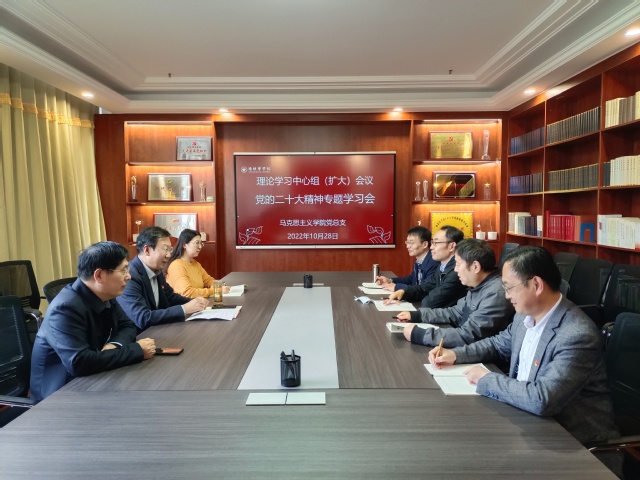 为扎实推动党的二十大精神进课堂、进教材、进头脑,10月28日下午,马克思主义学院党总支理论学习中心组(扩大)举行了党的二十大精神专题学习会。会议由党总支书记程乐森主持,党总支成员、支部书记、支部委员参加活动。